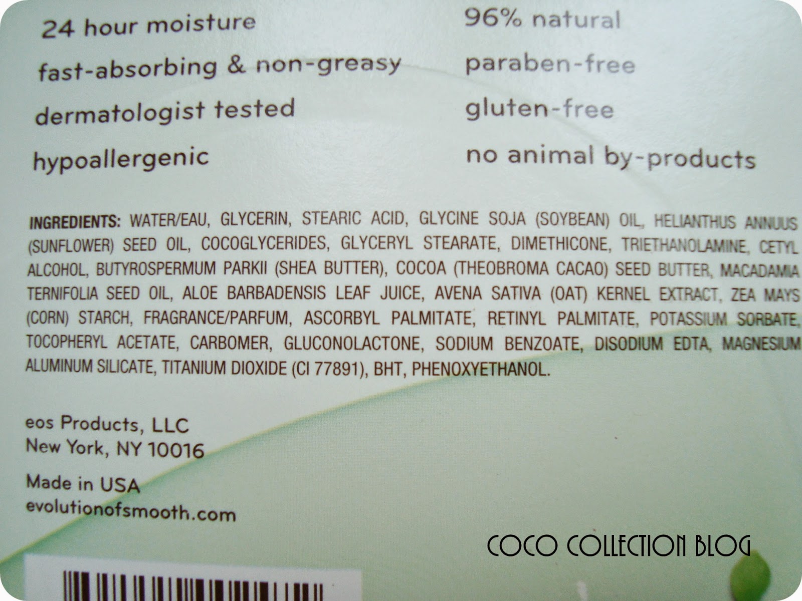 EOS Hand Lotion to krem do rąk w 96% składający się z naturalnych składników: masła Shea, ekstraktów z owsa, aloesu i wielu innych. Łatwo się wchłania i przyjemnie pachnie. Zapewnia 24 h nawilżenie. Poręczne opakowanie zmieści się do każdej torebki. Nie zawiera parabenów.