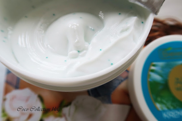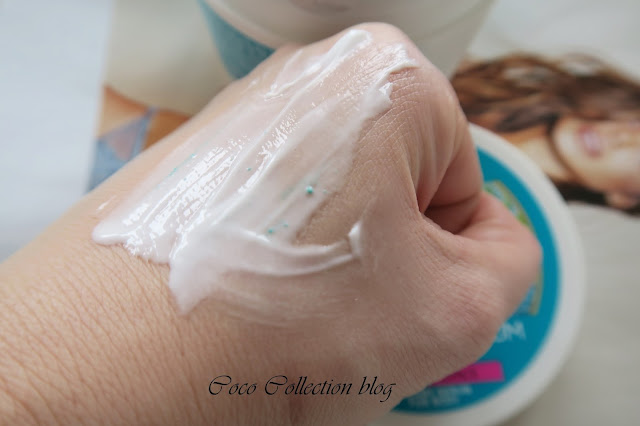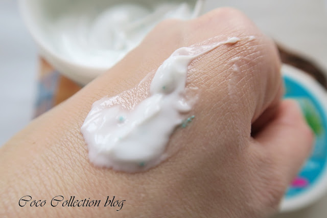 Kolejna ciekawa sprawa to konsystencja tego serum, która bardzo przypomina delikatne, kremowe masełko, ale zawiera mini drobinki w niebieskim kolorze. Pierwsze skojarzenie? Co tu robią drobinki peelingujące? Nic bardziej mylnego! Te maleńkie kuleczki podczas aplikacji znikają rozsmarowane na naszej skórze. Totalnie ich nie czujemy, ale wzbogacony nimi produkt wydaje się być jeszcze bardziej interesujący.