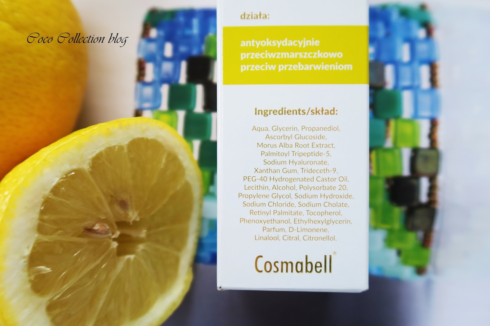 Znajdziemy tu takie składniki jak: wyciąg z białej morwy, kwas hialuronowy, lecytynę, witaminę E, peptydy, związki zapachowe i oczywiście witaminę C.
