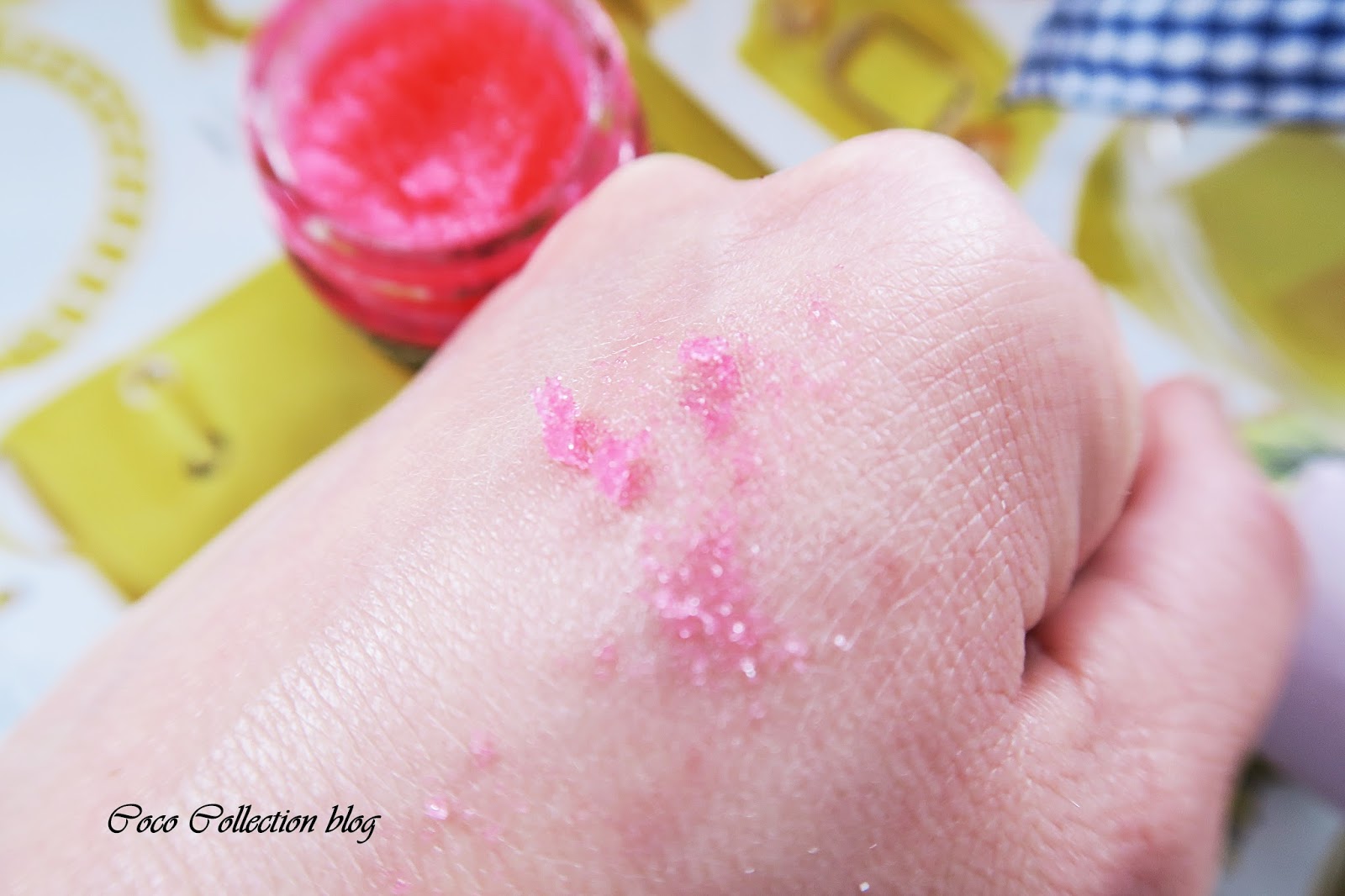 Uwagę w tym peelingu przyciąga nasycony, różowy kolor, a także zapach gumy balonowej. Tak słodki, aż chce się go zjeść. Nie jest to jednak naturalny aromat, bo w składzie tego kosmetyku znajdziemy nie tylko cukier, olej jojoba, barwniki, ale i sztuczne aromaty. Sami widzicie, że produkt ten nie do końca jest naturalny i choć stworzony na ciekawej bazie to z drugiej strony sami możemy przygotować sobie w domu takie cudeńko ze składników takich właśnie jak cukier, miód, olej lniany, czy olej kokosowy.