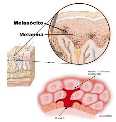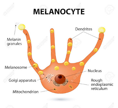 Melanina ( barwnik skóry ) powstaje w procesie melanogenezy. Jest ona naturalnym pigmentem o różnym natężeniu barwy, od czarnej przez brunatną, brązową, czerwoną do żółtej. Nadaje barwę skórze, włosom czy tęczówce oczu. Wytwarzana jest ona w komórkach specjalnie przeznaczonych do jej produkcji, w melanocytach. Skupiona jest ona właśnie tam w małe ziarenka zebrane w zbiornikach noszących nazwę melanosomy natomiast samo tworzenie się melaniny oparte jest na procesach utleniania i procesach biochemicznych ( melanogeneza ).