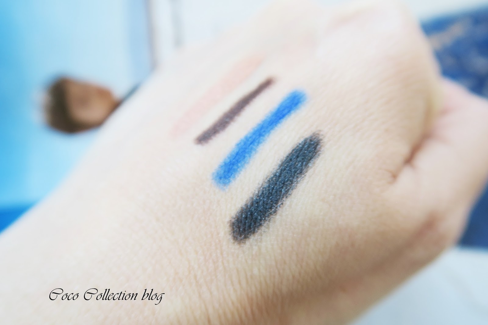 Zacznę od cieni w bardzo charakterystycznym rozwiązaniu. Z jednej strony mamy właśnie cień w kredce, bardzo miękkiej ale i grubej. Możemy rozprowadzić go na całej powiece, zastosować jako bazę pod inne cienie lub też wykonać nim kreskę, którą później rozetrzemy. Z drugiej strony mamy kohl kajal, którym z kolei wykonamy piękne kreski, podkreślimy dolną lub górną powiekę albo zastosujemy go na linii wodnej.