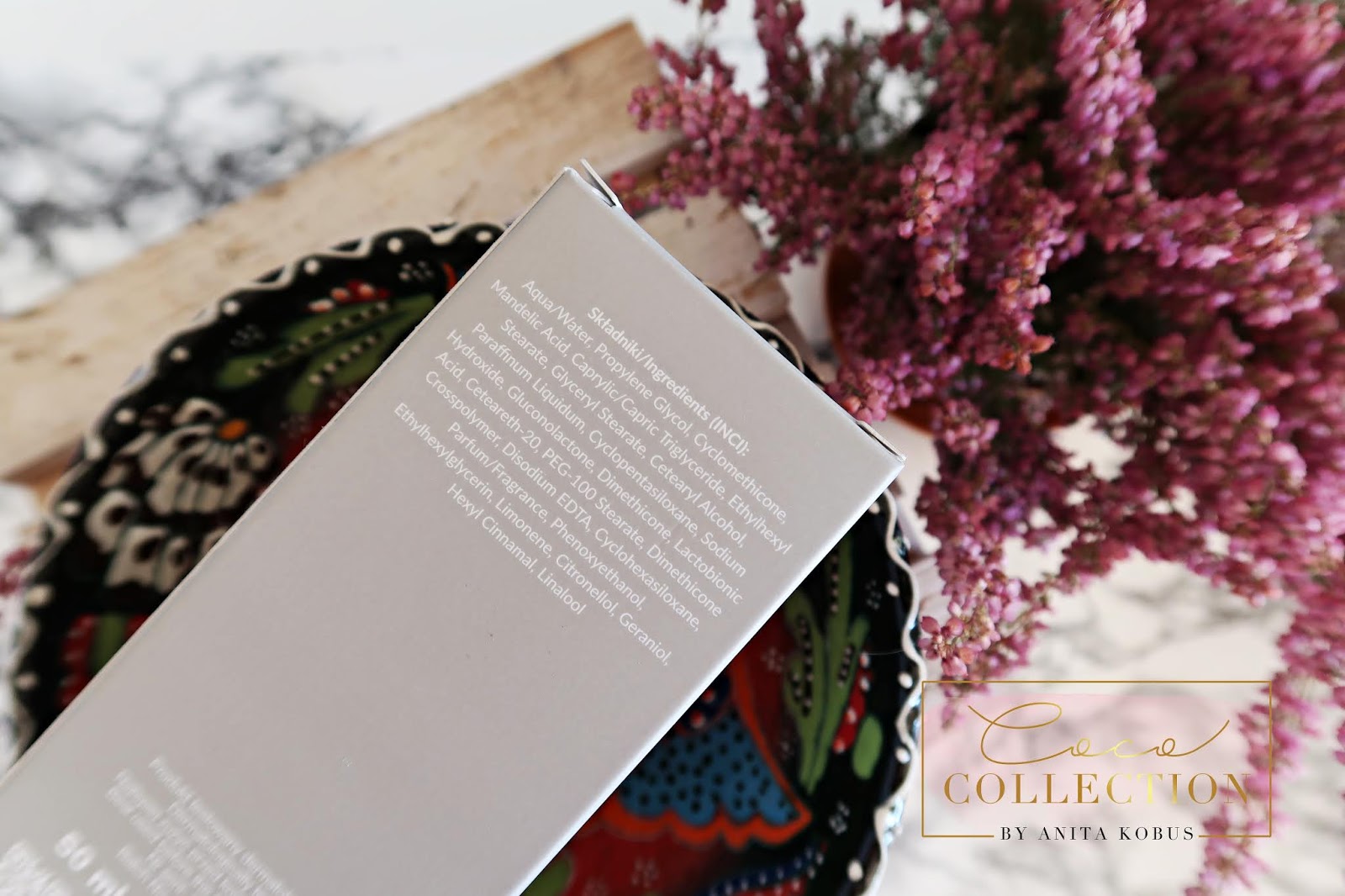 Mamy tutaj kwas migdałowy, glukonolakton, kwas laktobionowy, emolienty, związki zapachowe, ale jest też ciekła parafina i kilka łagodnych silikonów. Nie martwcie się zastosowaniem tych kontrowersyjnych składników, gdyż podczas stosowania kwasów, ważna jest okluzja na skórze i silne nawilżenie oraz nawodnienie, a te substancje właśnie temu służą.