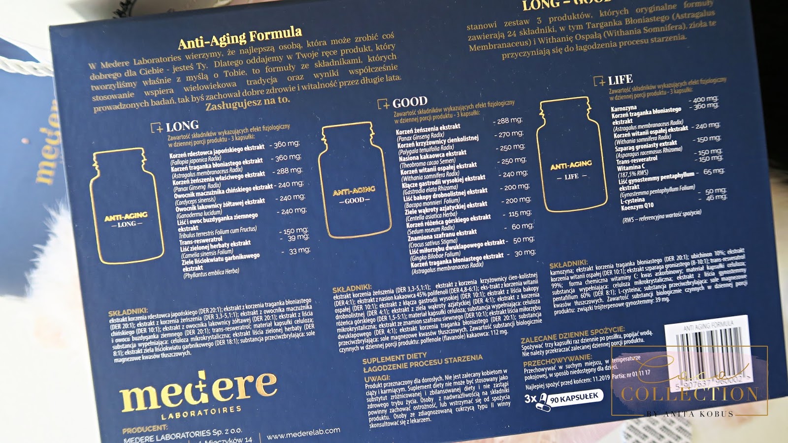 Otrzymuję piękne, granatowe pudełko. Dbałość o każdy cal. Otwieram je i widzę 3 szklane buteleczki, a na nich podział: Good, Long, Life. Czytam składy i oczom nie wierzę. 24 naturalne składniki, więc mamy tutaj bombę substancji aktywnych. 90-dniowy program w formie ogromnych kapsułek. Nie ukrywam, że ich wielkość również mnie zaskoczyła. W dodatku z każdego opakowania zażywamy po jednej, więc przełknięcie 3 dużych kapsułek na raz to dla mnie tortura. Ale czego się nie robi dla piękna i młodości. Wpadam na pomysł, że podzielę sobie preparat na pory dnia. Rano jedna, później druga, a wieczorem trzecia 😉 Zabieram się za testowanie!