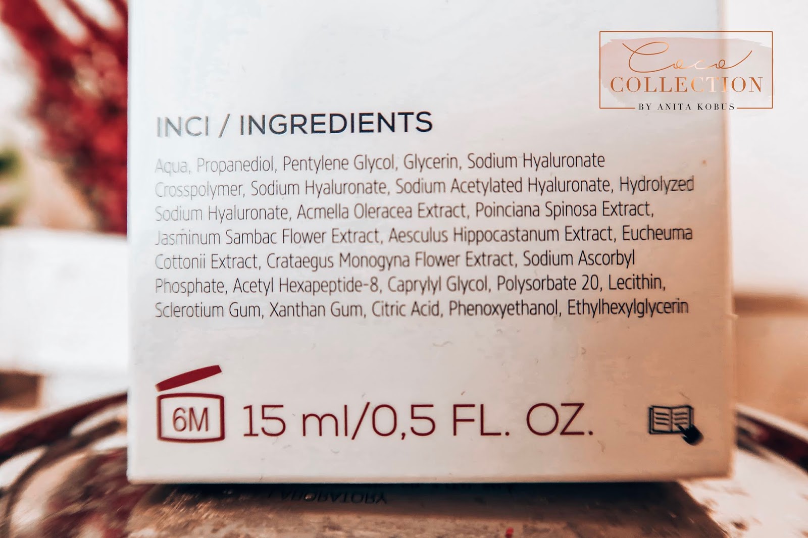 Gliceryna i różne cząsteczki kwasu hialuronowego. Do tego ekstrakt z jeżówki elektrycznej, która nazywana jest roślinnym botoksem. Plus ekstrakt z poinciana spinosa, ekstrakt z jaśminu, ekstrakt z kasztanowca, ekstrakt z wodorostów i ekstrakt z głogu. To wszystko połączone z witaminą C i argireliną ( peptydem działającym jak botoks ). Można by rzec WOW! Oczywiście na końcu składu znajdziecie konserwanty, lecytynę czy zagęstniki, ale … Nie da się ukryć, że kompozycja jest rzeczywiście bardzo dobrze przemyślana. Co więcej nie może w owym produkcie zabraknąć nanodysków, które transportują substancje aktywne w głębsze warstwy skóry.
