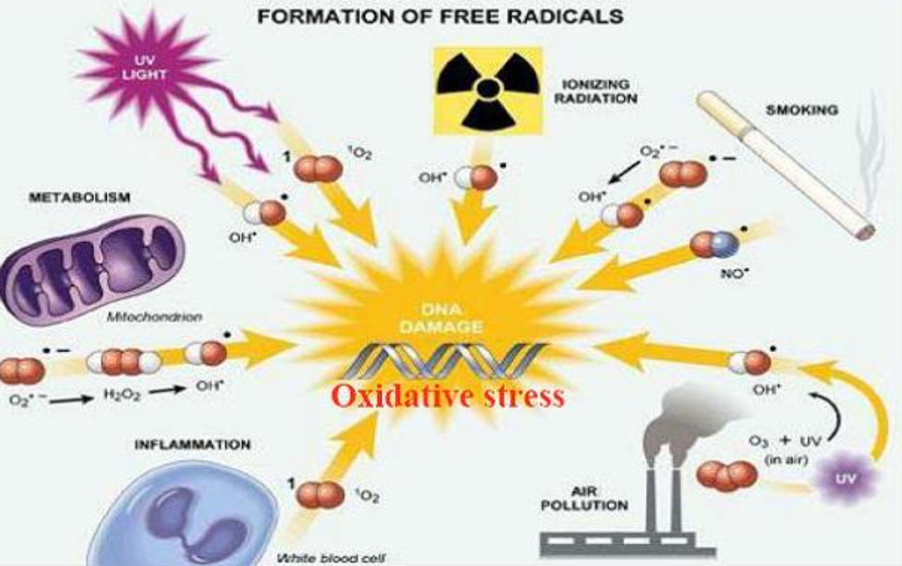 Wiele rodników tlenowych powstaje w wyniku naturalnych procesów metabolicznych w naszym organizmie, jak np. oddychanie tlenowe czy procesy zapalne. Odgrywają one również ważną rolę w prawidłowym funkcjonowaniu komórek. Uczestniczą np. w skurczach mięśni, wydzielaniu hormonów, w funkcjonowaniu układu obronnego. Biorą udział w usuwaniu leków z ustroju. Warunkują aktywność bakteriobójczą i bakteriostatyczną śliny. Jak widzicie, nie są takie złe, ale… niestety problem pojawia się wtedy, gdy zaczynają być tworzone w nadmiarze! Co może powodować taki stan? Wiele czynników.