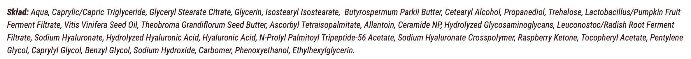Nie myślcie sobie, że to koniec, bo w masce znajdziemy jeszcze trehalozę, która jest wspaniałym humektantem. Wiąże wodę w naskórku, przez co wpływa na stan nawilżenia skóry. Mamy także Vitis Vinifera Seed Oil – olej z pestek winogron, czyli tłusty emolient. Bardzo ważne połączenie z humektantami. Jest i łagodząca alantoiną, gliceryna, są nowoczesne konserwanty i nie ma za to zapachów.